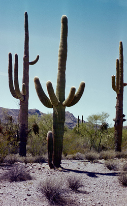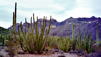 Twenty-six different species of cacti call Organ Pipe National Monument home. In addition to the organ pipe cactus, there are some fine examples of my old friends - the saguaros. The photo to the right shows just a few of these majestic giants. They are a site to behold and each saguaro cactus is a little ecosystm unto itself - both supporting and supported by a wide array of other plants and animals.